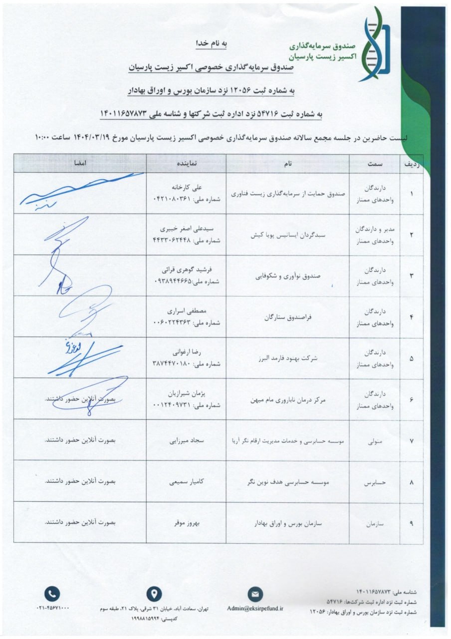اسامی حاضران در جلسه مجمع صندوق در تاریخ ۱۴۰۳/۰۳/۱۹ساعت ۱۰(تصویب صورتهای مالی سال ۱۴۰۲ صندوق)